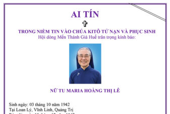 Nữ tu Maria Hoàng Thị Lê thuộc Dòng Mến Thánh Giá Huế đã được Chúa gọi về lúc 11g00 ngày 26.08.2025.