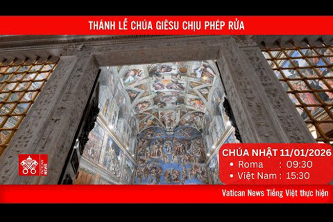 Vatican News Tiếng Việt truyền hình trực tiếp Thánh Lễ Chúa Giêsu Chịu Phép Rửa với nghi thức Rửa Tội Trẻ Em tại Nhà nguyện Sistine trong nội thành Vatican (11.01.2026) do Đức Thánh Cha Lêô XIV chủ sự.