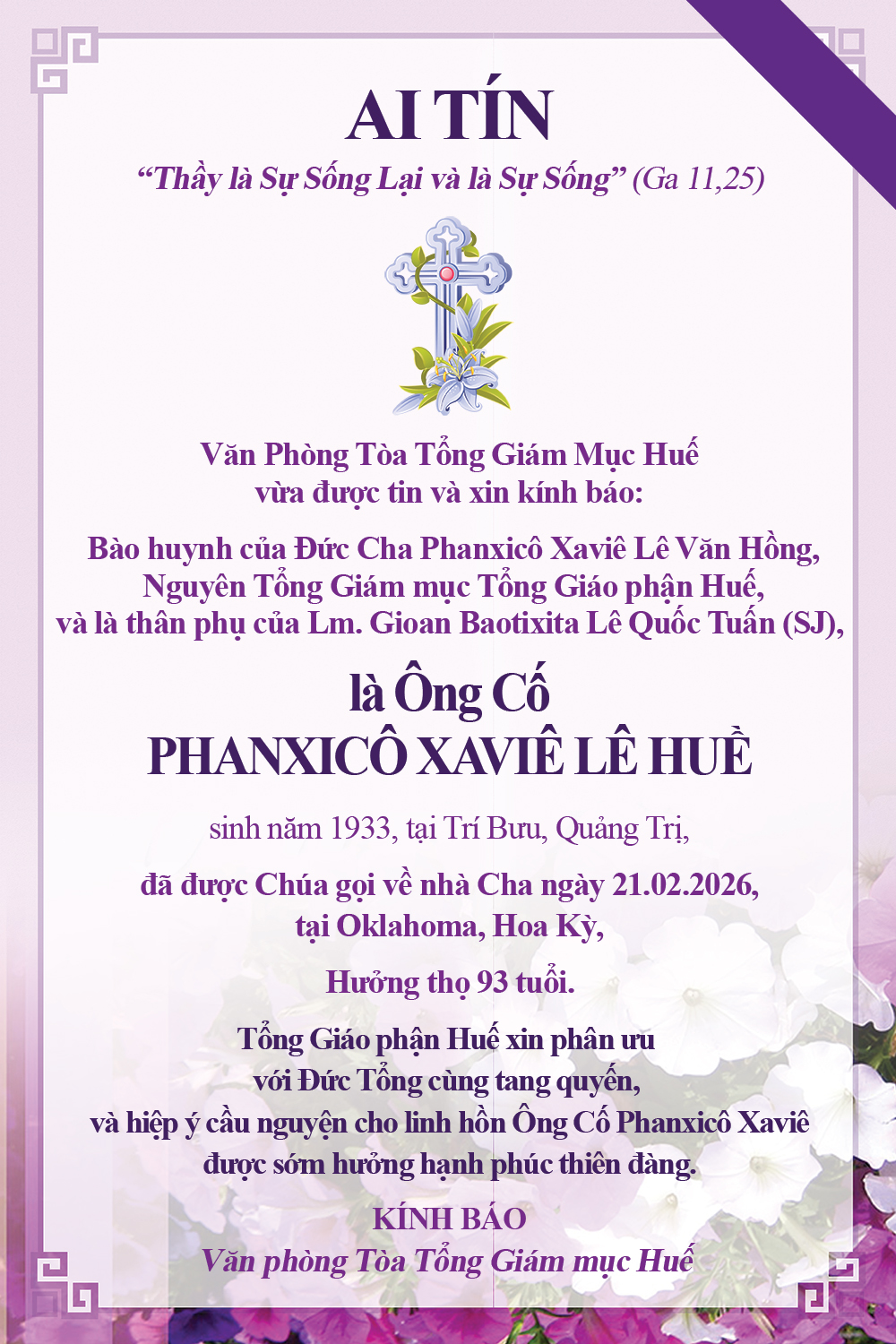 Home » Tin tức » Thông báo » Ai tín về Bào Huynh của Đức Cha Phanxicô Xaviê Lê Văn Hồng – Nguyên TGM Huế vừa qua đời