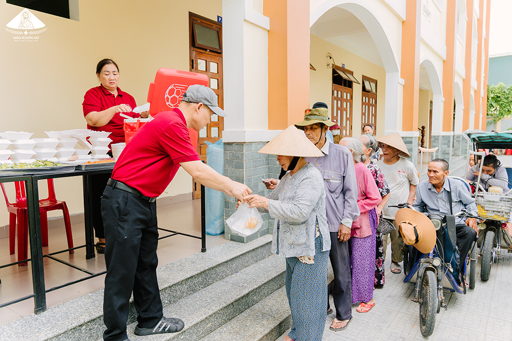Đến ngày thứ 7, các anh chị em đến tại khuôn viên Nhà Mục vụ của Giáo xứ để nhận cơm. Tại đây, các anh chị em này có 2 sự lựa chọn: ngồi ăn tại chỗ với đầy đủ bàn ghế, quạt mát, nước uống, khay cơm, đũa muỗng đảm bảo vệ sinh; hoặc nhận cơm hộp đem về nhà. Đối với những anh chị em già yếu, bệnh tật không thể di chuyển, Ban Caritas cũng bố trí người đưa đến tận nhà. Mỗi phần cơm đầy đủ 3 món: mặn, xào và canh; đầy đủ cá, thịt, rau củ quả, đảm bảo dinh dưỡng; thực đơn cũng được thay đổi liên tục.