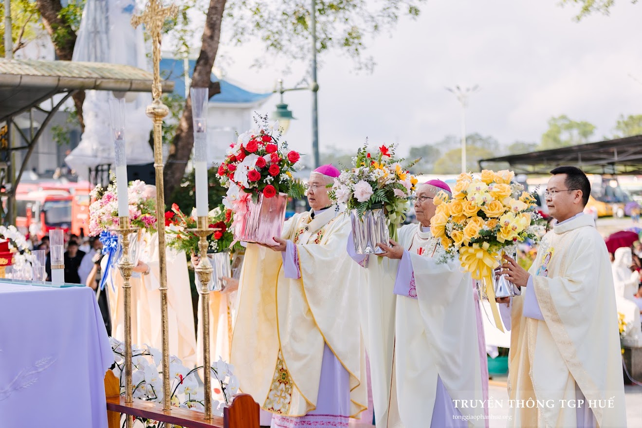Kết thúc cuộc rước kiệu, Đức TGM Giuse cùng với quý Đức Nguyên TGM, Cha Tổng Đại diện và Cha Đại diện Giám mục dâng hoa lên Thánh tượng Đức Mẹ La Vang tại Linh đài trong lời ca tôn vinh của toàn thể cộng đoàn hiện diện.