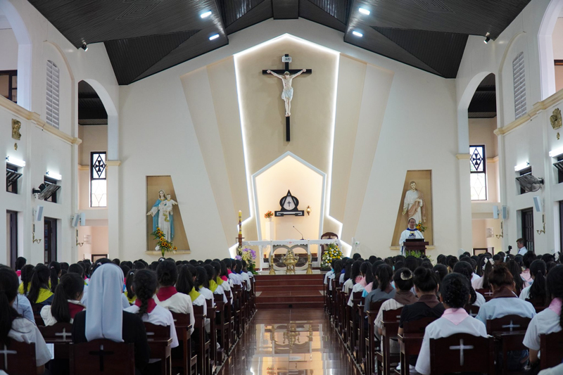 Vào lúc 10g00, Thánh lễ Tạ ơn được cử hành tại Nguyện đường của Hội dòng thật trang nghiêm và sốt mến. Qua Thánh lễ, các em được mời gọi tiếp tục nhận ra, lắng nghe và đáp lại tiếng Chúa như hình ảnh Người Mục tử và đoàn chiên. (Ga 10, 1-10). Sau Thánh Lễ các em dùng cơm trưa với nhau trong tình gia đình.