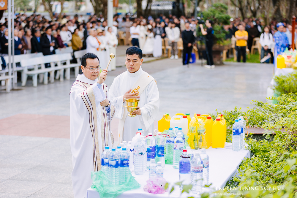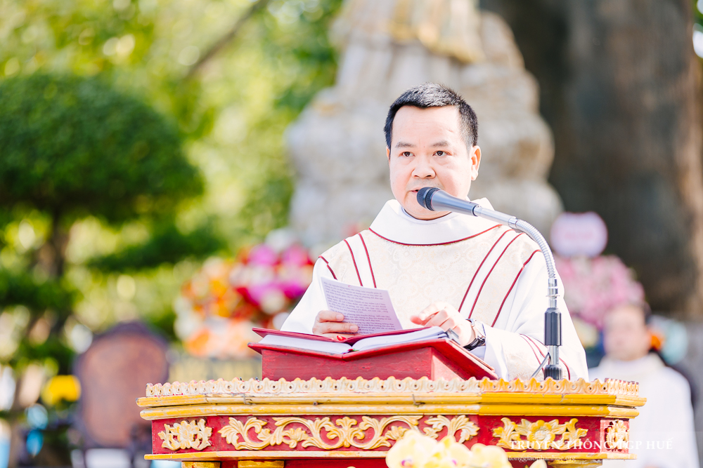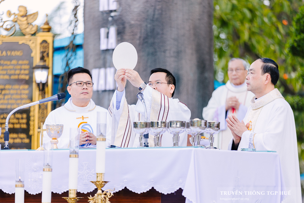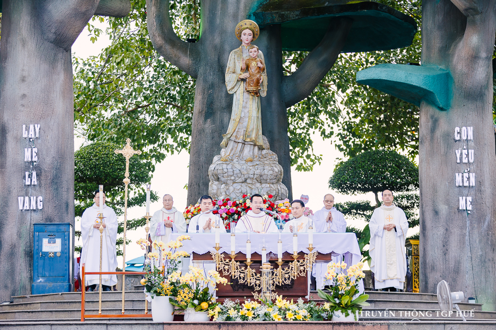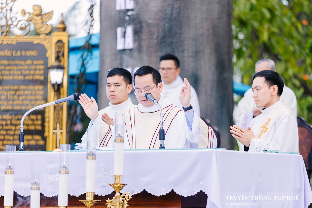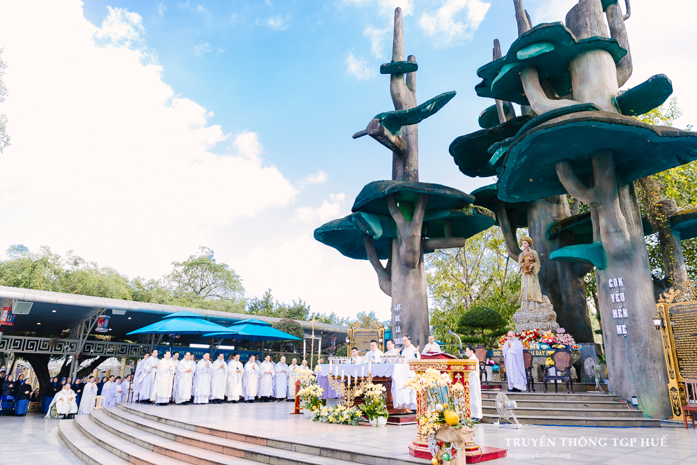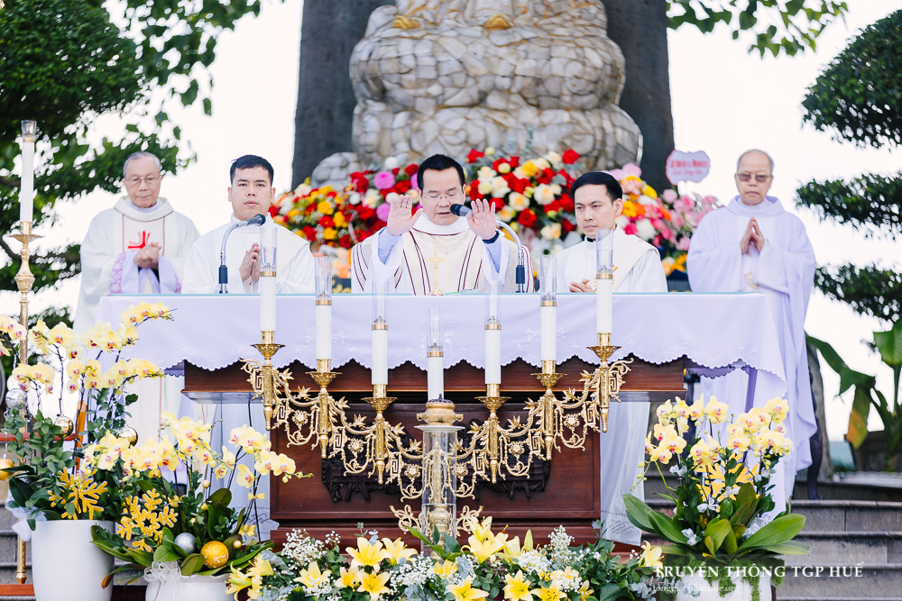 Thánh lễ được Cha TĐD Barnaba cử hành lúc 08g00 sáng thứ Bảy ngày 03.01.2026. Đồng tế có Đức Cha Phanxicô Xaviê Lê Văn Hồng – Nguyên Tổng Giám mục TGP Huế, Đức Ông Giuse Nguyễn Văn Chánh, Đức Ông Giêrônimô Nguyễn Ngọc Hàm, Cha Giuse Lê Văn Hồng – Tổng Quản lý Giáo phận, Cha Phaolô Trần Văn Quang – Quản xứ La Vang, Hạt trưởng Hạt Quảng Trị, cùng quý Cha trong và ngoài TGP. Sốt sắng hiệp dâng Thánh lễ có quý Thầy Phó tế, quý Tu sĩ nam nữ, Chủng sinh, anh chị em giáo dân trong TGP cũng như nhiều Giáo phận khác hành hương về bên Đức Mẹ trong những ngày đầu năm.