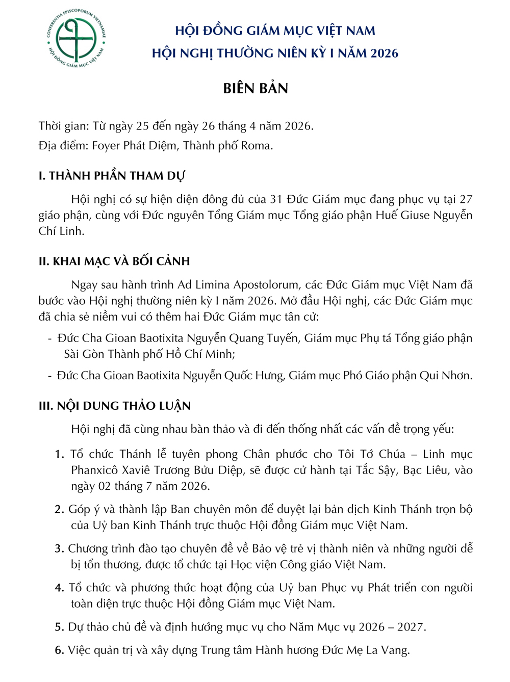 Hội đồng Giám mục Việt Nam đã tiến hành Hội nghị thường niên kỳ I năm 2026, tại Foyer Phát Diệm, Thành phố Roma, từ ngày 25 đến ngày 26 tháng 4 năm 2026. Sau đây là nguyên văn Biên bản Hội nghị.
