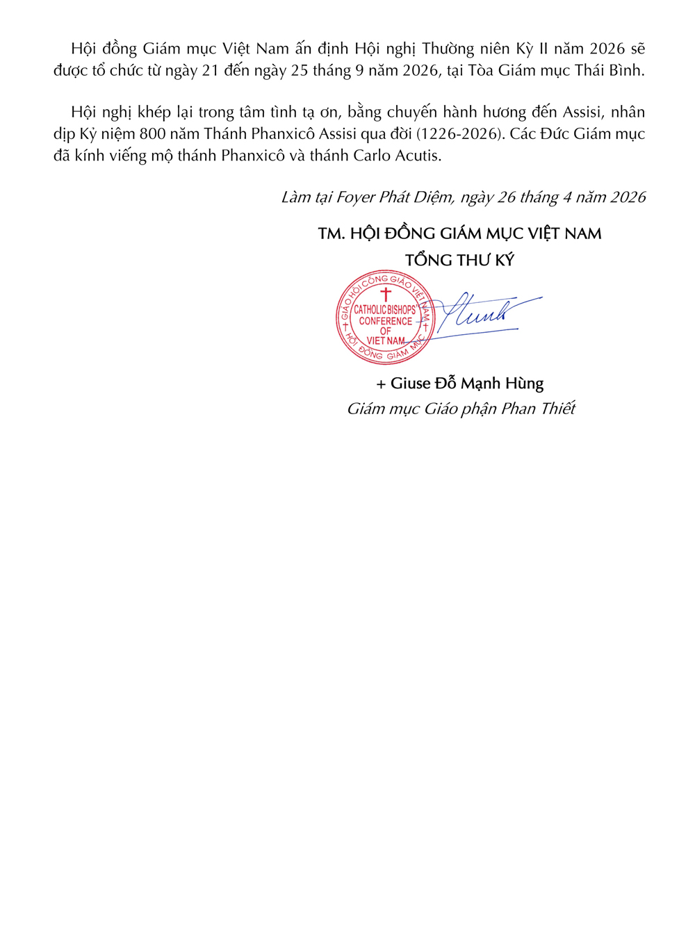 Hội đồng Giám mục Việt Nam ấn định Hội nghị Thường niên Kỳ II năm 2026 sẽ được tổ chức từ ngày 21 đến ngày 25 tháng 9 năm 2026, tại Tòa Giám mục Thái Bình.