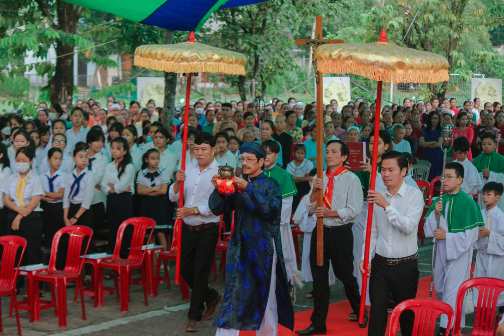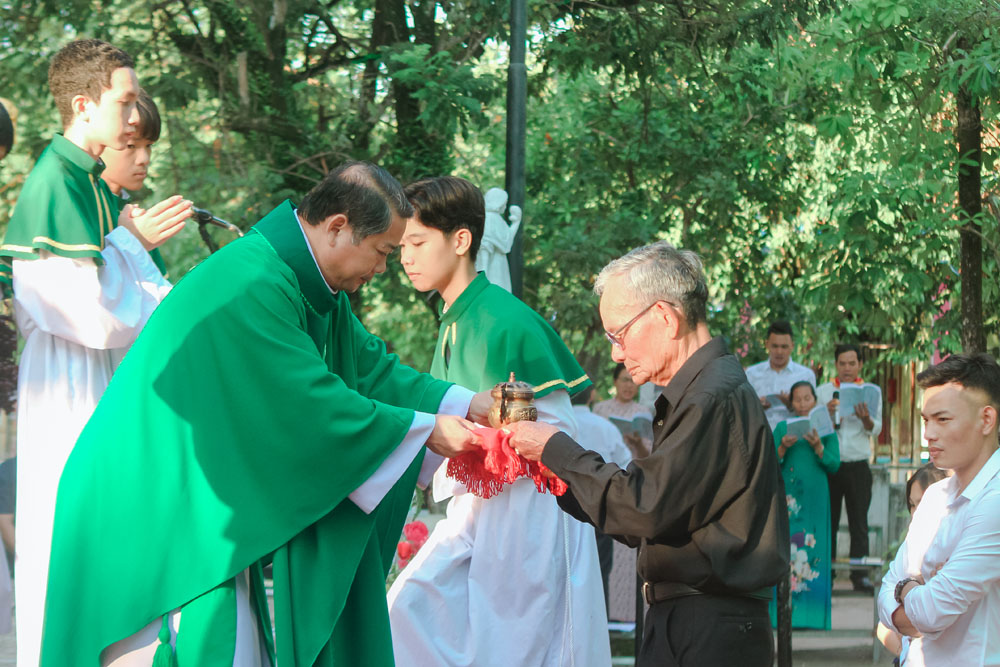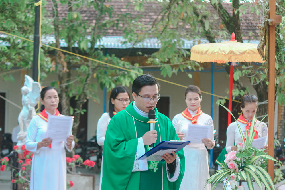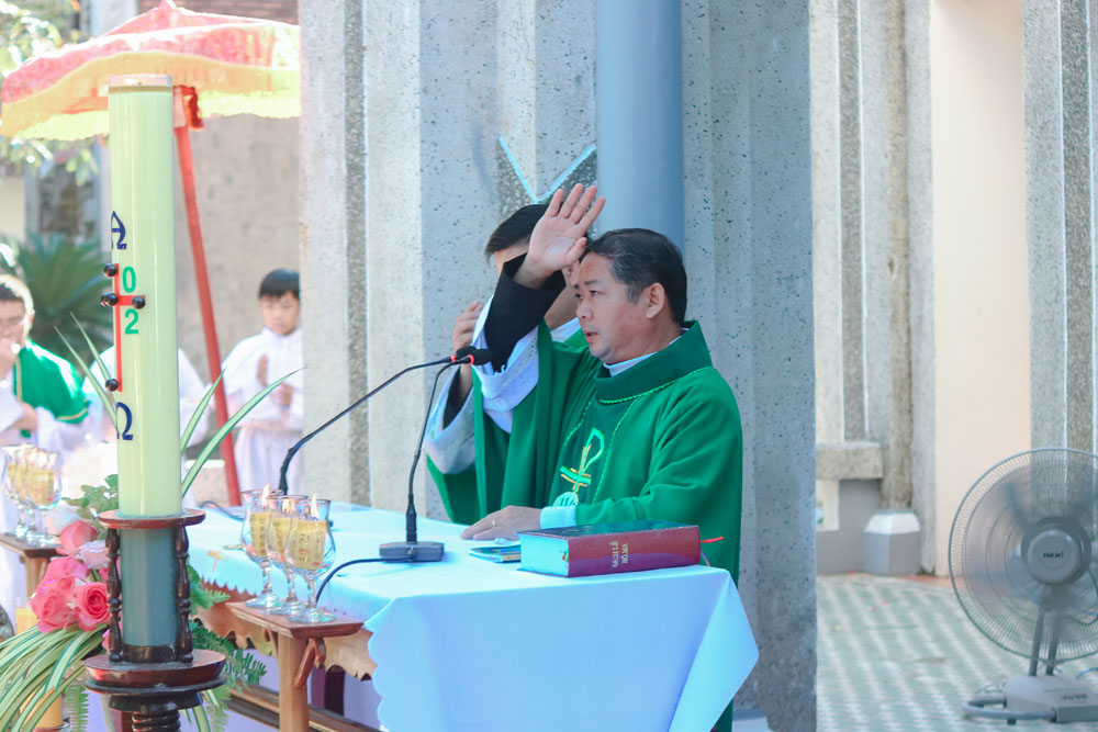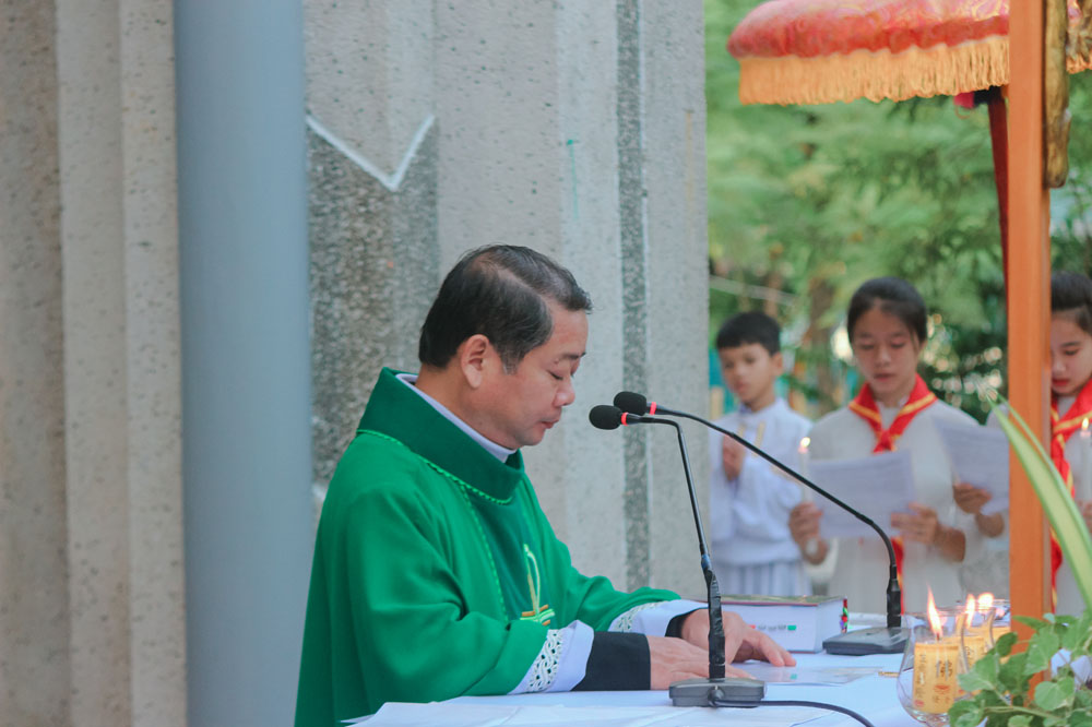 Thánh lễ được cử hành lúc 05g30 tại sân tiền đường nhà thờ, do Cha Quản xứ Phanxicô Xaviê Hồ Văn Uyển chủ tế, cùng đồng tế có Cha Phó xứ Bênêđictô Phạm Văn Hoàng và với sự tham dự của đông đảo mọi thành phần trong cộng đoàn Giáo sở.