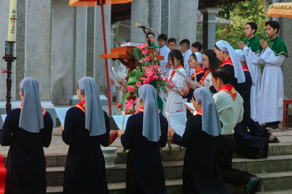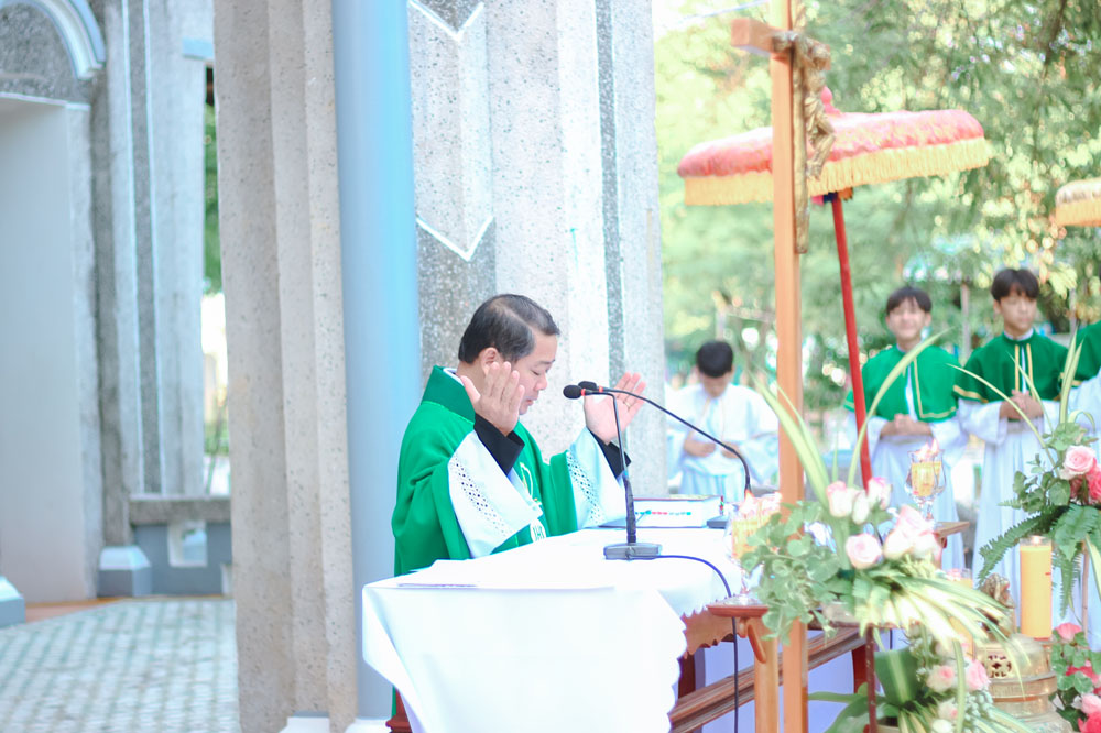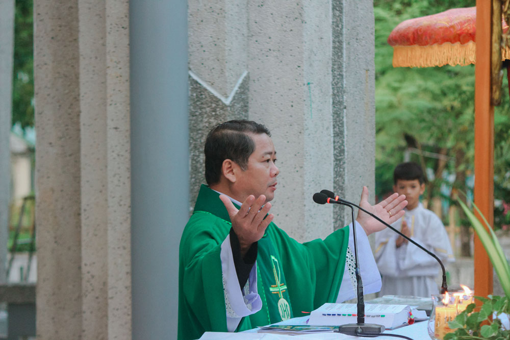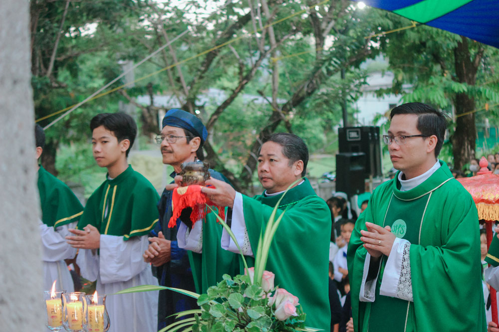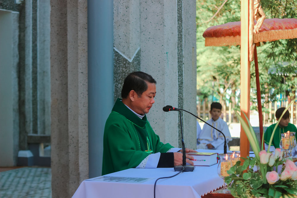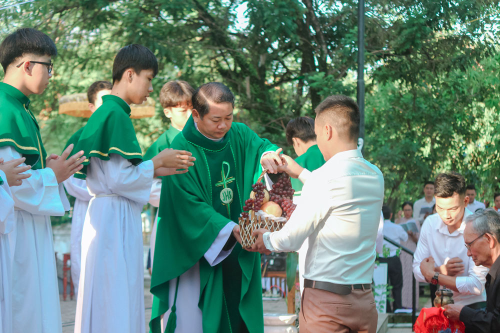 Thánh lễ được cử hành lúc 05g30 tại sân tiền đường nhà thờ, do Cha Quản xứ Phanxicô Xaviê Hồ Văn Uyển chủ tế, cùng đồng tế có Cha Phó xứ Bênêđictô Phạm Văn Hoàng và với sự tham dự của đông đảo mọi thành phần trong cộng đoàn Giáo sở.