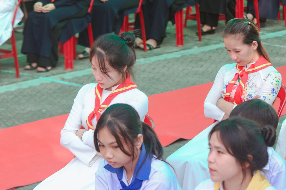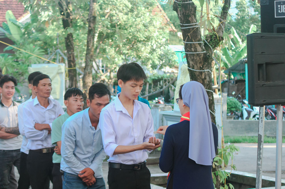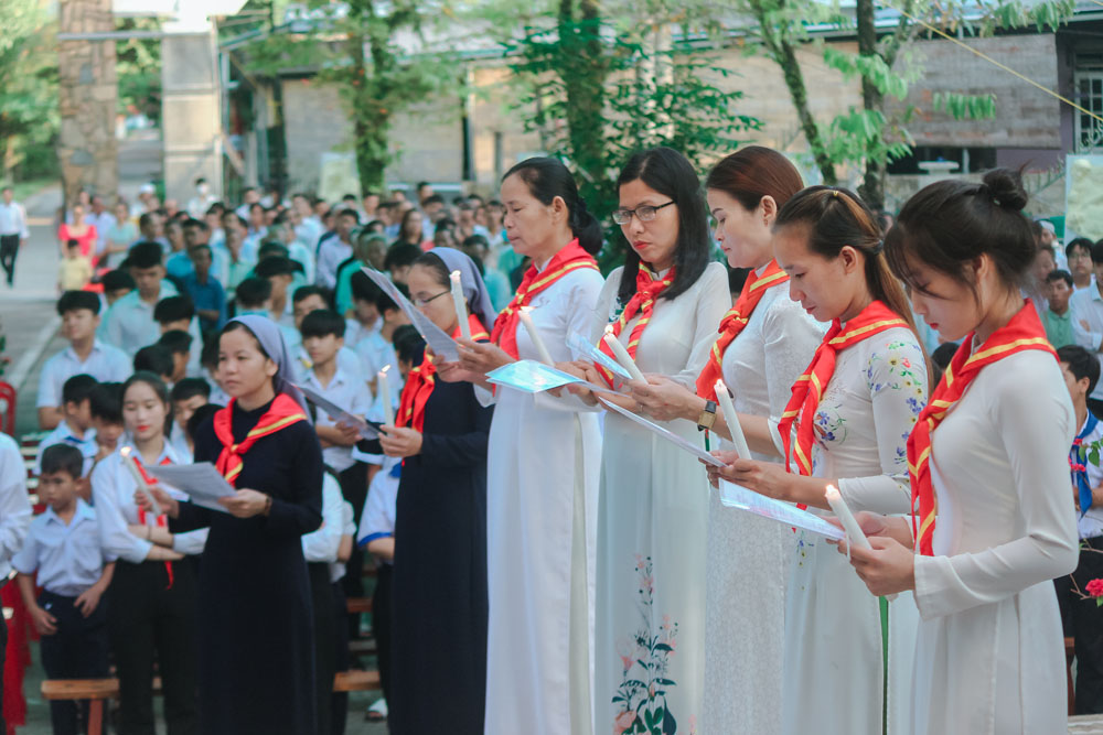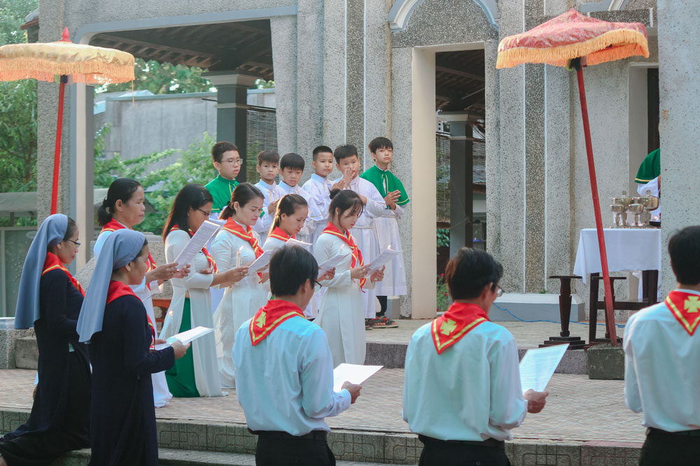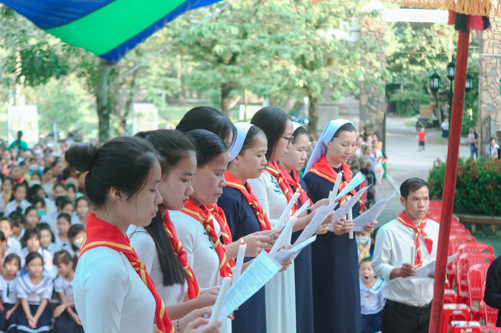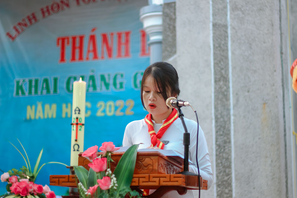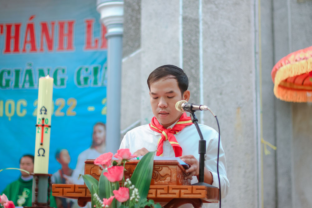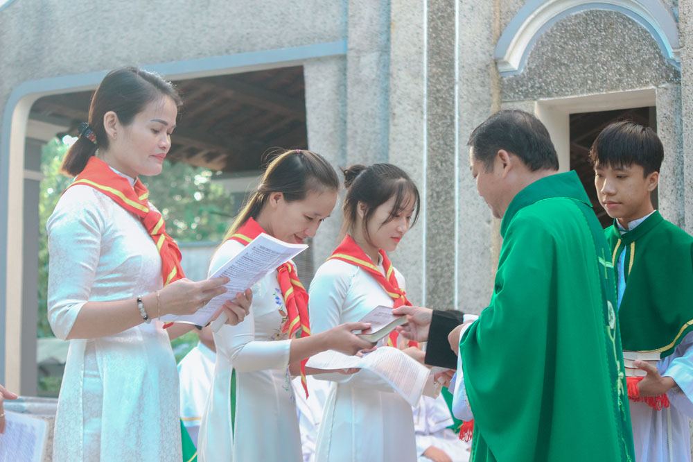 Sau bài giảng là Nghi thức dấn thân của các anh chị Giáo lý viên trong năm học này. Cha Phó xứ – Đặc trách Ban Giáo lý giới thiệu lên Cha Quản xứ 33 anh chị sẽ đảm nhận việc dạy Giáo lý cho hơn 320 em với 12 lớp trong năm học 2022-2023 này. Sau khi thẩm vấn Cha Đặc trách cùng các anh chị Giáo lý viên, Cha Quản xứ đặt tay chúc lành cho các anh chị Giáo lý viên, đồng thời, các anh chị với nến sáng trong tay cũng đã bày tỏ sự vâng phục, niềm tin và lòng xác tín của mình qua Kinh Tin kính. Kết thúc nghi thức, Cha Quản xứ trao sách Phúc Âm cho từng anh chị trong lời ca của ca đoàn và cộng đoàn: “Này chính Chúa đã sai tôi đi, sai tôi đi loan báo Tin Mừng…”