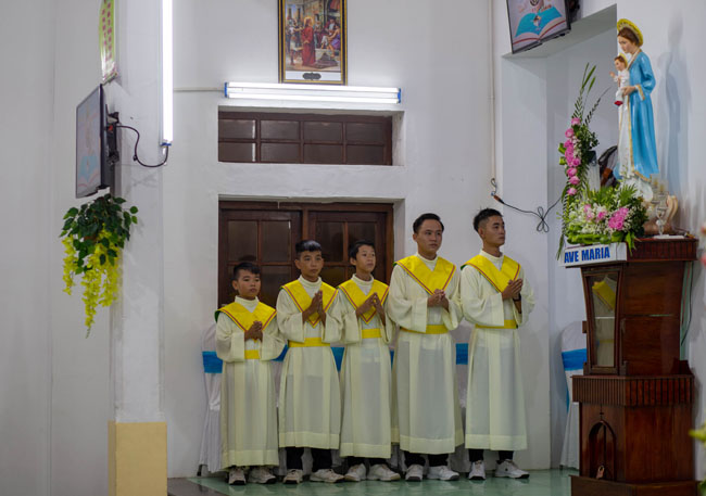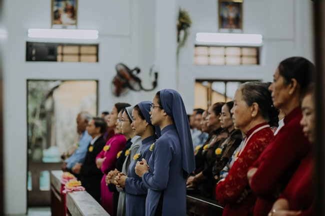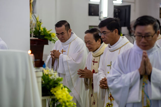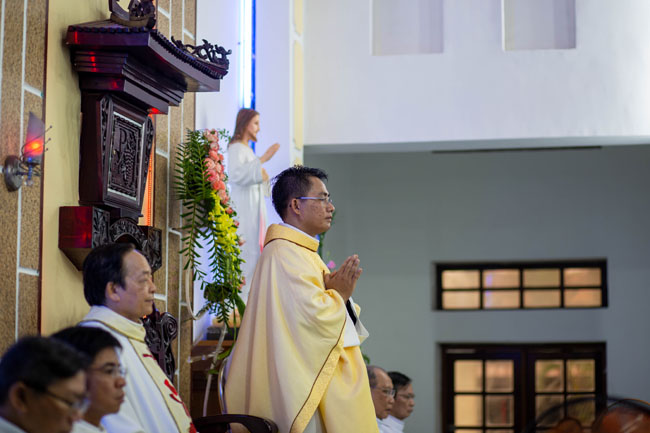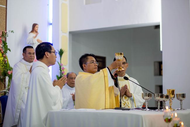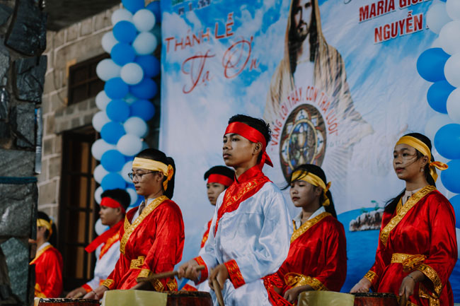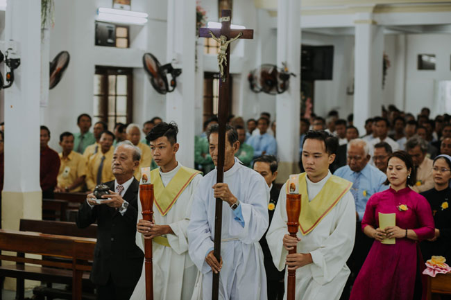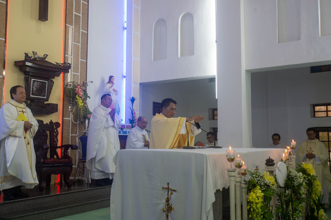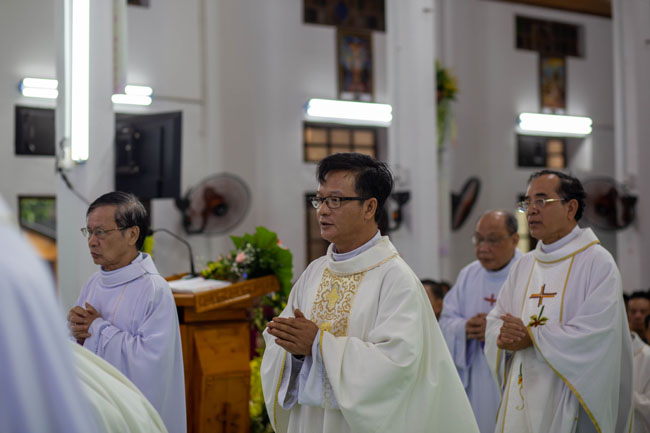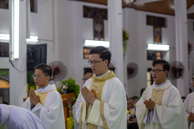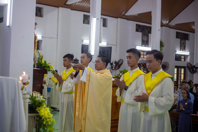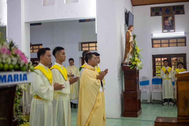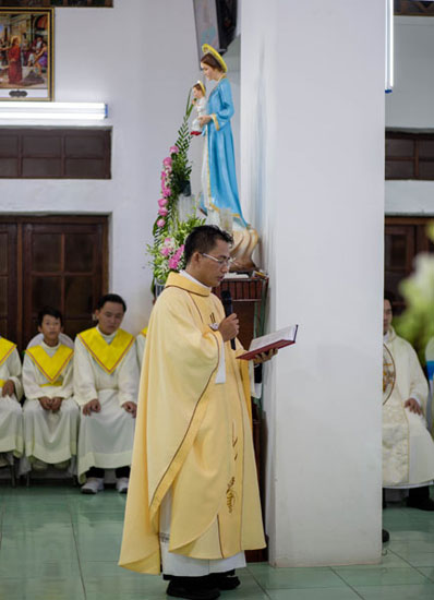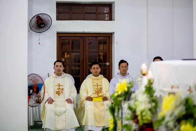 Đúng 08g30, hòa cùng tiếng trống rộn ràng, đoàn đồng tế và gia đình tân chức tiến vào nhà thờ để cử hành Thánh lễ Tạ ơn trong cơn mưa hồng ân.